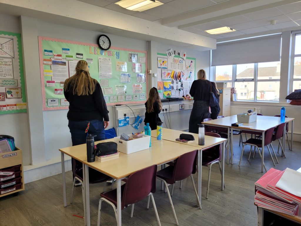 Wederom worden we door Kyle gebracht ditmaal niet naar zijn eigen setting, maar naar Kirklandneuk Primary School, een mainstream basisschool. Al bij aankomst valt de ontvangst door leerlingen op: zij leiden ons rond, wijzen trots op gangen vol projecten, musicals en school points (muntjes) die worden verdiend met taakjes (deuren openhouden) en prestaties. De school is niet alleen aangekleed; ze verbeeldt leren in vitrines en wanden, waardoor het product van inspanning zichtbaar en deelbaar wordt.
